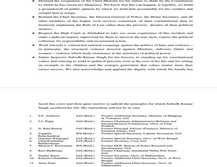 मुख्यमंत्री के नाम भेजे गए अपने पत्र में रिटायर्ड ऑफीसर्स का कहना है कि योगी आदित्यनाथ ने बुलंदशहर हिंसा को गंभीरता से नहीं लिया। इसके अलावा वह सिर्फ गोकशी केस पर ध्यान दे रहे हैं।