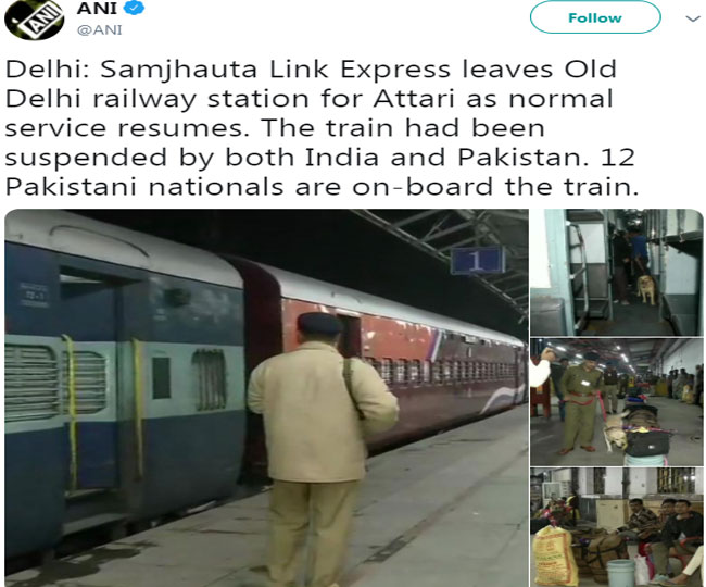 यहां यह बता देना जरूरी है कि भारतीय वायुसेना की पाकिस्तान अधिकृत कश्मीर में 26 फरवरी को तड़के आतंकी ठिकानों पर कार्रवाई और वायुसेना के जांबाज विंग कमांडर पायलट अभिनंदन की वतन वापसी के बाद रविवार को समझौता एक्सप्रेस दिल्ली से अटारी के लिए रवाना हुई है। इससे पहले भारतीय वायुसेना द्वारा की गई कार्रवाई के बाद पाकिस्तान ने अपनी ओर से ट्रेन सेवा रद कर दी थी। इसके बाद भारत ने भी 28 फरवरी को समझौता एक्सप्रेस ट्रेन का परिचालन रद कर दिया था।